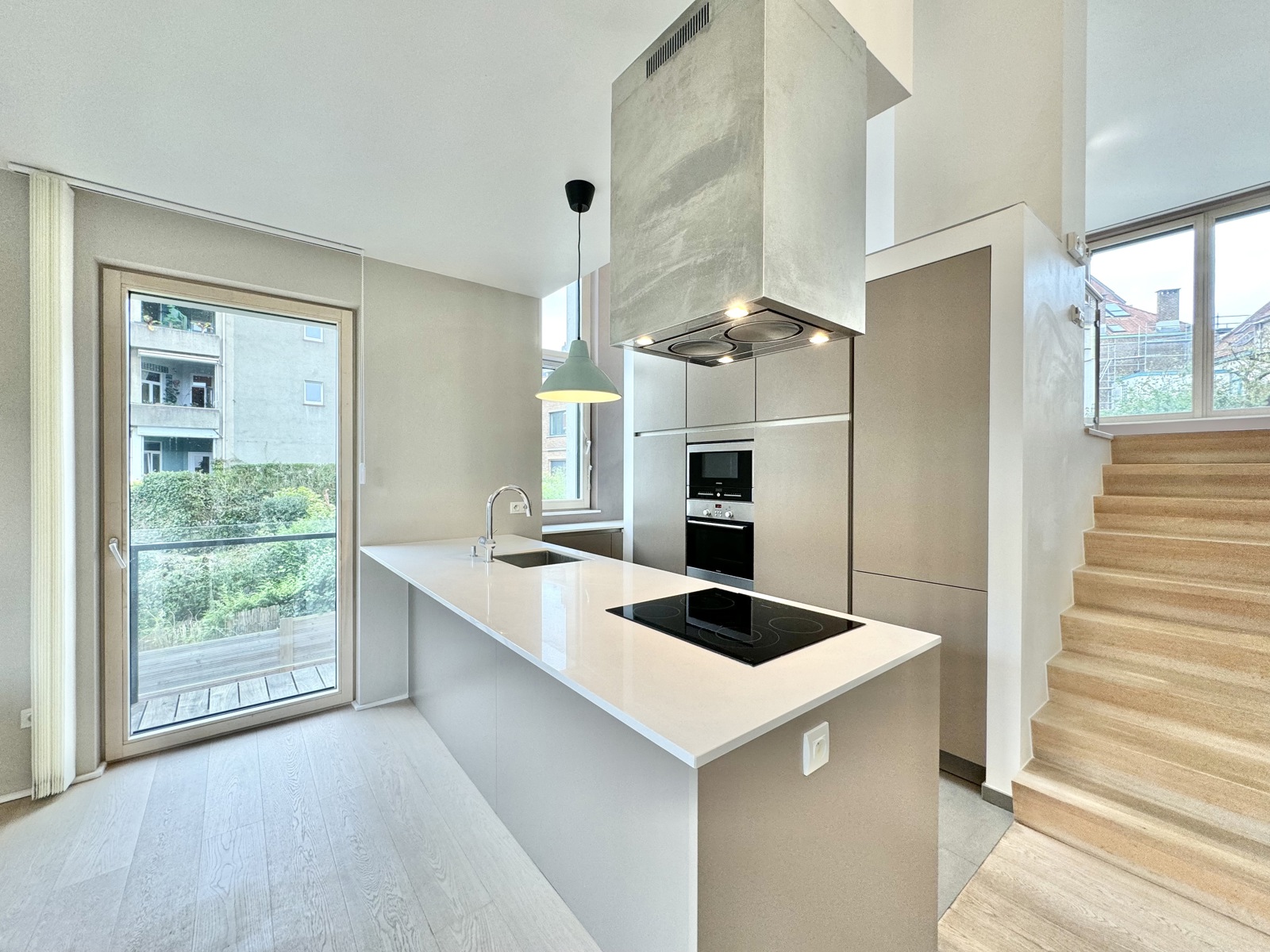 - Cuisine américaine équipée et salle à manger avec balcon